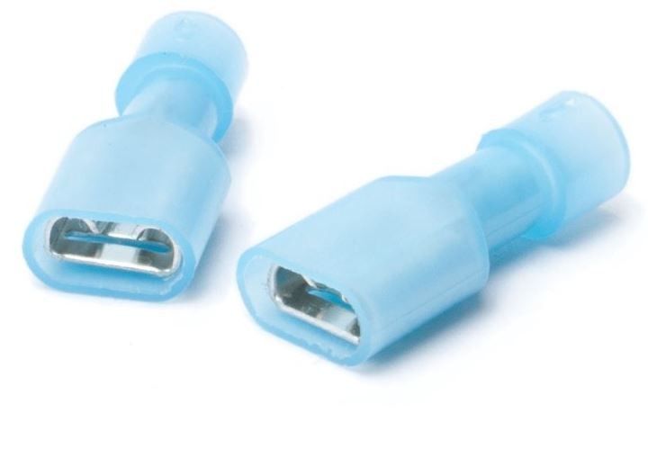 Terminal hembra tipo Fastón de 1/4", calibre 14-16, con aislante completo azul: Conector hembra con un ancho de 1/4" (6.35 mm) y diseñado para cables de calibre 14 a 16 AWG, con aislamiento completo en color azul. Proporciona una conexión segura y aislada con terminales macho tipo Fastón, ideal para aplicaciones en sistemas eléctricos que requieren protección adicional contra cortocircuitos y contactos accidentales.