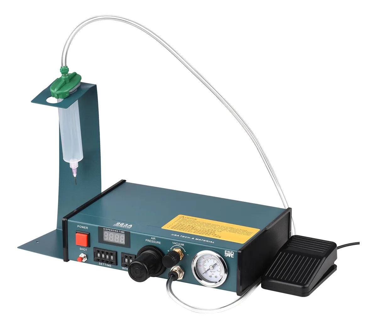 Modos de control e interruptores duales: modo automático y semiautomático conmutable, y equipado con un interruptor de mano y un pedal para controlar la dispensación de pegamento con la mano o el pie.